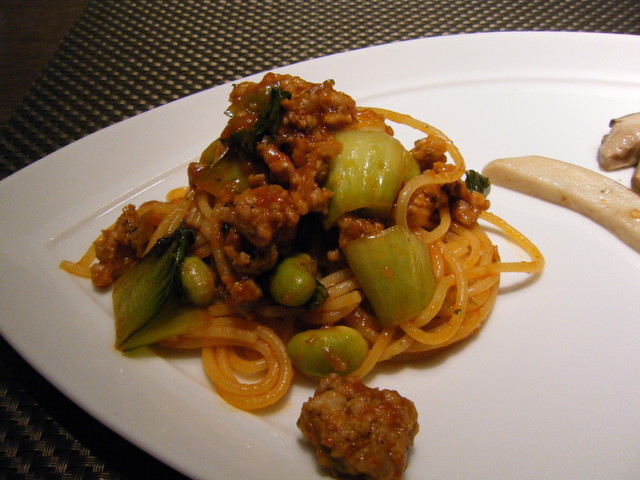 ◎カスペと竹の子と花わさびのトマトソーススパゲティーニは、