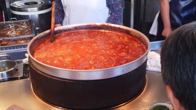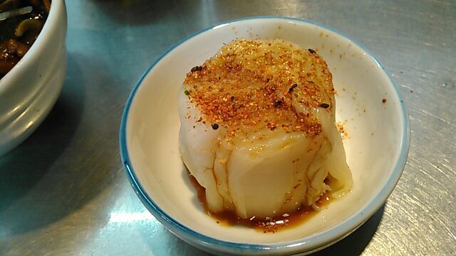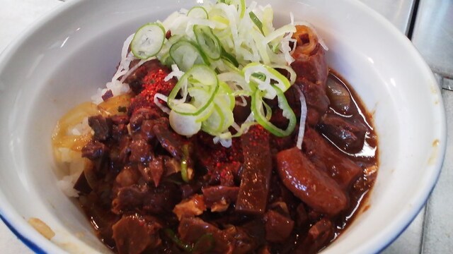 ★2017・5再訪 ダチの干物屋で「かちり」を買ってから覗きに行くと、久々の雨にも関らず店前はごった返してます。っと言ってもちゃんとお客は座って食べてますので、渋滞を引き起こしていたのは外人観光客のカメラ攻撃を必死に阻止する大女将と若くない若女将とのせめぎ合い原因です(笑)これはこの店が在る限り一生終わらないのでしょうね(笑)今日は「ホルモン大盛りに小ライス・お新香・麦茶」のスペシャルセットを大女将がお盆で渡してくれたので、久々のスタンド席で食べました。隣で肉豆腐とホルモン丼をキャッキャ言いながら美味しそうに食べていた女性二人、時代は変わりました。。。(笑)