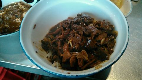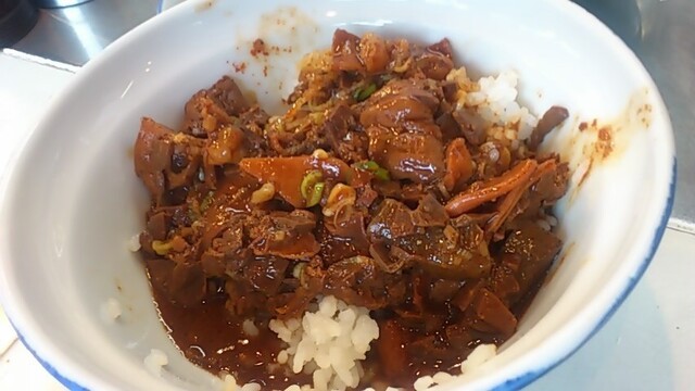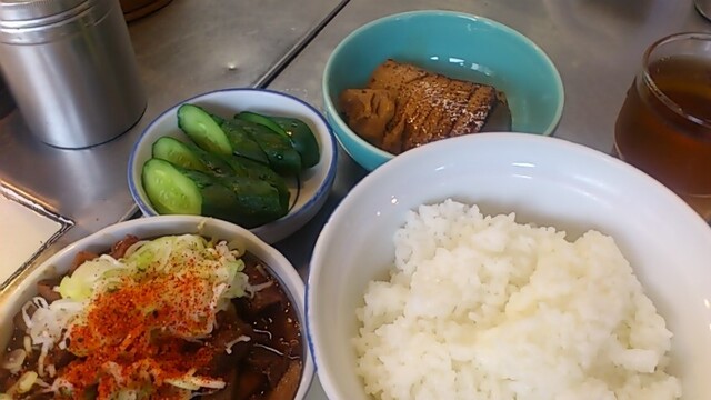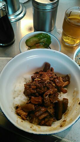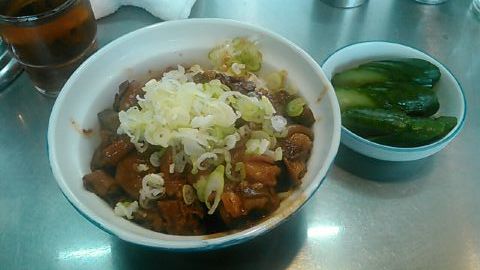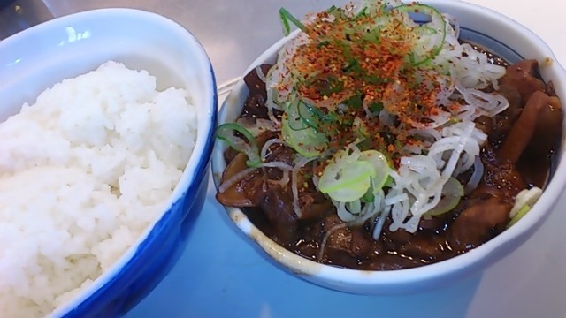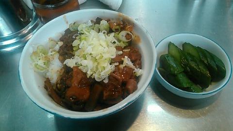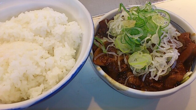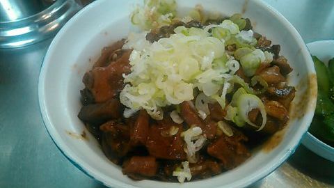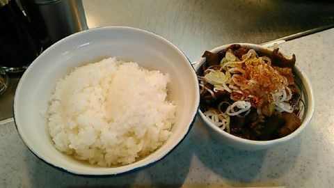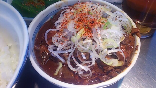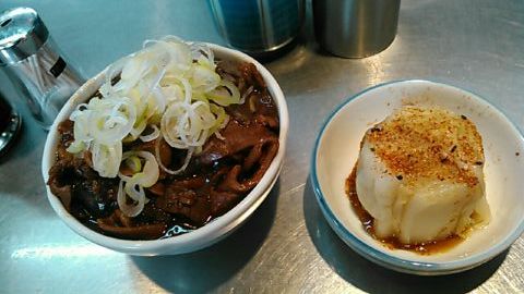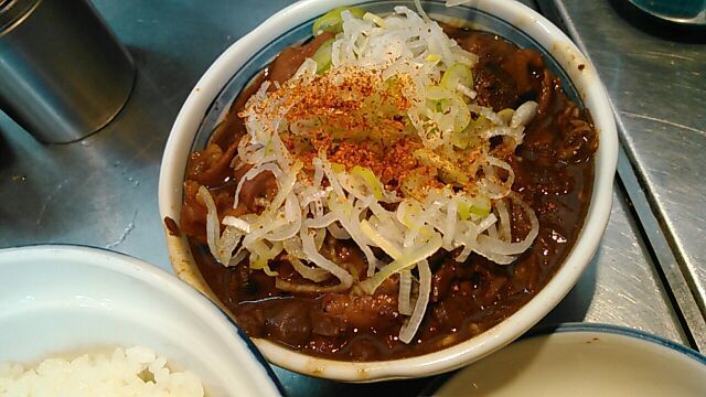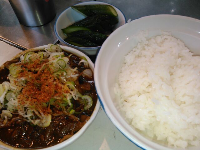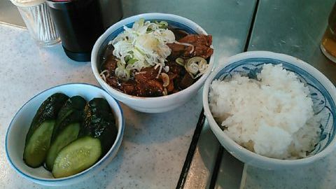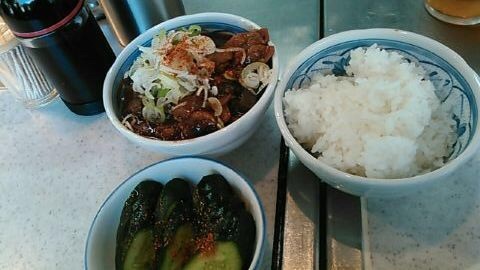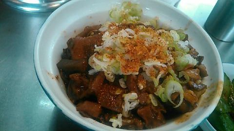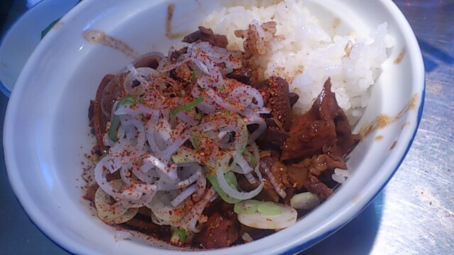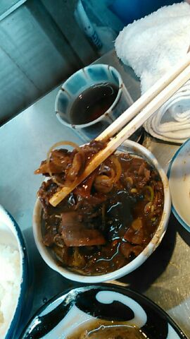 ★2015・7再訪 幸軒を出て、雨の中2~3軒寄ってから訪店、当たり前ですがまだ腹一杯です(笑)相変わらずソコソコ混んでいましたが、少しはばーやが心を開いたのか、チャイナ客も多く居ました(笑)そのばーやに挨拶をするといつも通り「食べてけ~」、席まで空けてくれました(笑)ホルモンは大盛りなのでライスは小盛り、あとはお新香ですがこれでもキツかった。。。(*_*; チャイナの若い二人連れのお客が、牛丼1つをシェアしたいとの注文、大女将のばーやは頑なに拒否してましたが、そこはよく出来た若くない若女将、「まあイイですよ~特別ね~♥」だって、ばーやには出来ないだろうな~?時代も変わって行くんですね。。。(笑)(*_*;