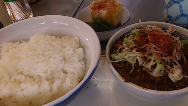 ★2017・11再訪 干物屋のダチから「刺身で旨い良いブリが入ったから」と連絡があったので出かけて来ました。その前にまず「幸軒」を覗くとまだ9時ちょい過ぎなのに「今日の営業は終了しました」の張り紙が。。。大将に訊くに疲れちゃったそう、やる気ありません(笑)ルーティンは逆となりますがそのまま「きつねや」にGO!相変わらず大女将はご機嫌ナナメですが、火曜日でそれほど混んでいないせいかパニくってはいません(笑)スーッとごはんの中にホルモン、お新香のセットが出て来てすぐに「豆腐は食べるか?牛皿は食べるか?」。。。昔と違ってもうそんなに食えないよとやんわり断ってから実食!ほんと旨いね。。。今年はもう最後かな?お世話になりました。年が明けると初訪問から46年です、年取る訳だ、食えなくなる訳だ。。。(泣笑)