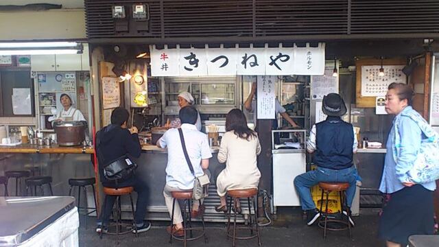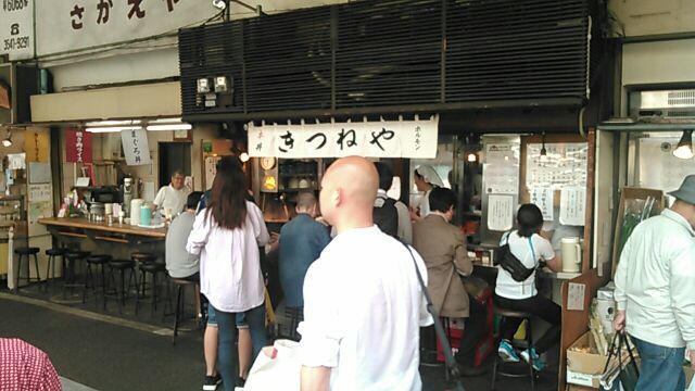 ★2017・9再訪 先月3日の火事でその被害に遭った店の2代目店主が、ななんと小生の後輩だったことが判明しました。それはつい先日送られて来た母校の同窓会会報で知ったのですが、奇遇にも40数年前、自分が河岸の鮭屋に居た時の同じ鮭屋の仲間であって、先代の店主とは毎日顔を合わせていた取引先だったのだから驚きです。せっかくだからと「きつねや」を覗くと店前は相変わらずの混雑、色々な言葉が飛び交ってます(笑)ライス小のホルモン丼を食いながらその鮭屋の行方を訊くと、ななんと昔から付き合いがあって避難先の店まで教えてくれました、流石です(笑)今日はもう遅くて会えませんでしたが、本当人生って分からないものです。ホルモンごちそうさんでした、美味かった~♪!(^^)!