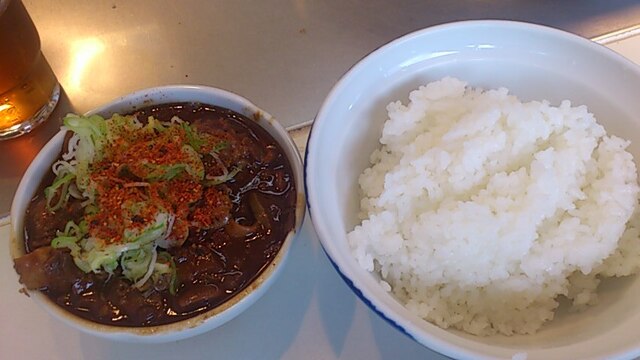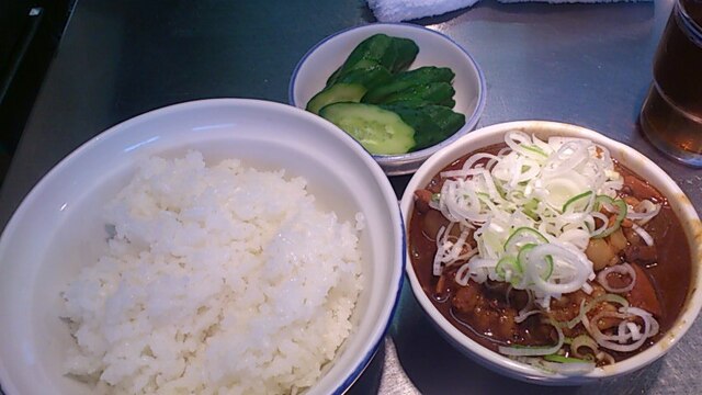 ★2014・8再訪 「幸軒」で冷やしにフラれ、アタマに来て久々の訪店。数日来ない間に河岸もずいぶん変わりました。大きな肉屋が半分カレー屋になっていたり、店主が代替わりしていたり、一番驚いたのは昔勤めていた店が閉店し、違う店になっていたこと^^。これも時代の流れか、年を感じます。その点ここ「きつねや」は全然変わらない、相変わらず大女将は感じ悪いしね(笑)変わったのは決っして若くはないけど若女将ですか?昔はこんなに気が強くなかった(笑)今日はそんなに混んでなくて、いつもの席に座ると何も言わずにス~っと「ホルモン煮・ライス・お新香」が出てくる、そしておまけに崩れた「焼き豆腐」、これが又旨い!若いときは2杯食えたけど、もうダメですね。若女将が「この前、○○さんの子分だっておじさんが来てくれましたよ~♥」「そんなヤツ知らねェ~」と言っておきました(笑)そーいえばスタンド席にオッパッピ~の小島よしお氏が・・・彼もここのファンなんだってさ(笑)
