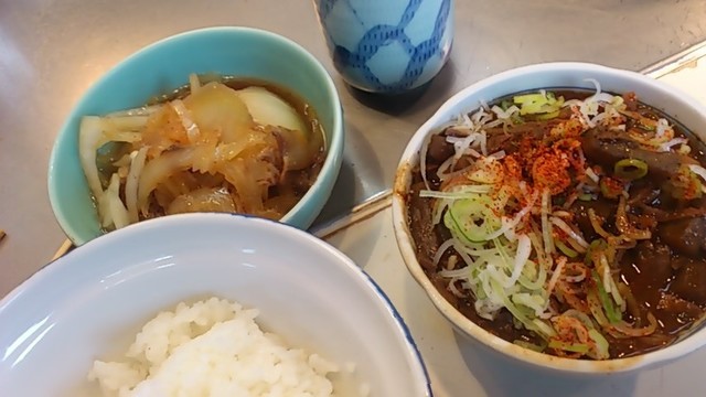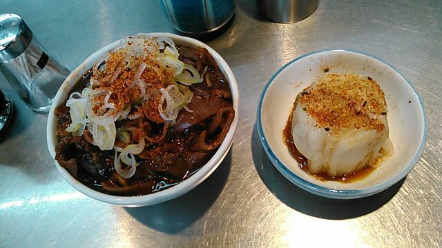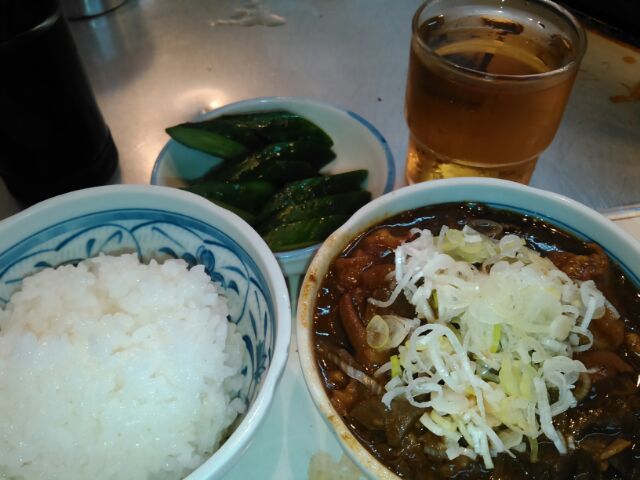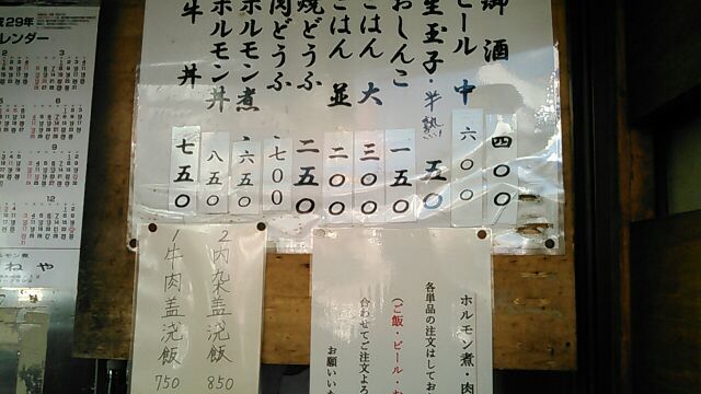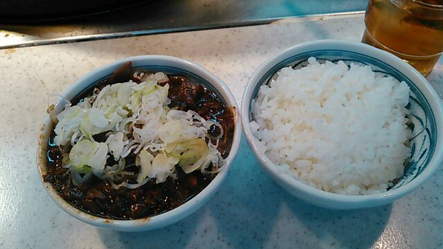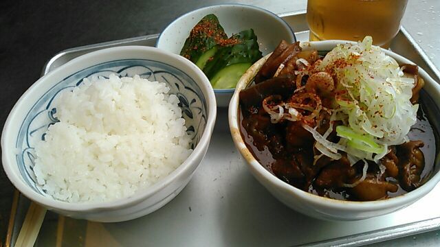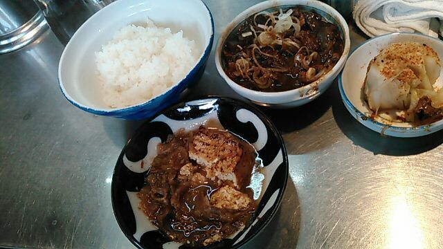 今日は比較的空いているとはいえ、この「きつねや」だけは異常に混んでいて大女将、若くない若女将は相変わらずヒートアップしてます(笑)いくら高校生張りの食欲でも今の今ですから、そうは食えないなと店頭に、自然な流れで座らされ、ホルモン、小ライス、お新香、おまけ肉豆腐、が並べられ、「さあ~食え!」ですからもう拷問に近いものが」あります(笑)ホントはホルモンだけで十分なんですが、他のお客の手前うまくないのでライスも付けます、それが辛い(笑)最近は一人女子客がホルモン丼をカッ食らう姿をよく見ます、時代は変わりました。。。( ゚Д゚)