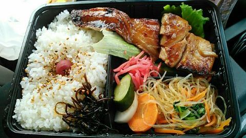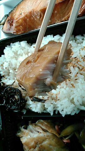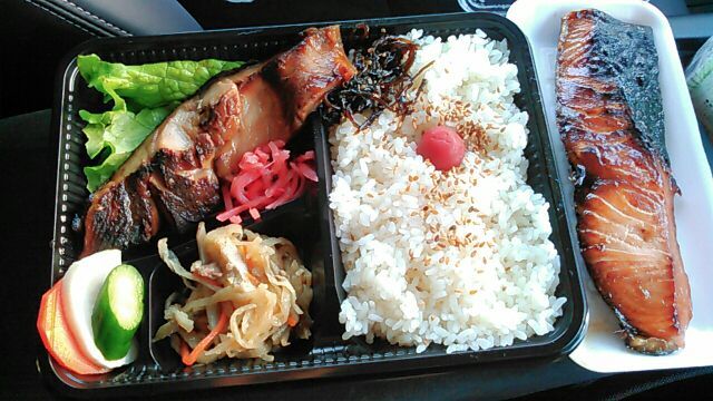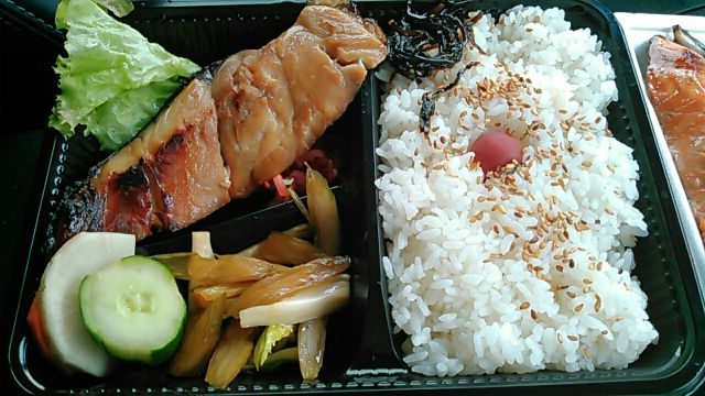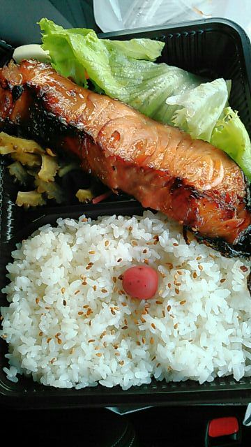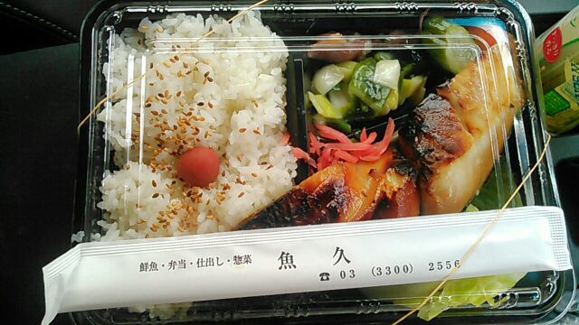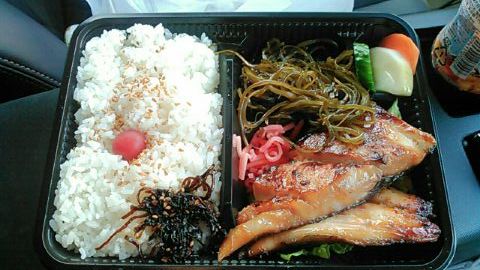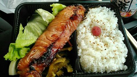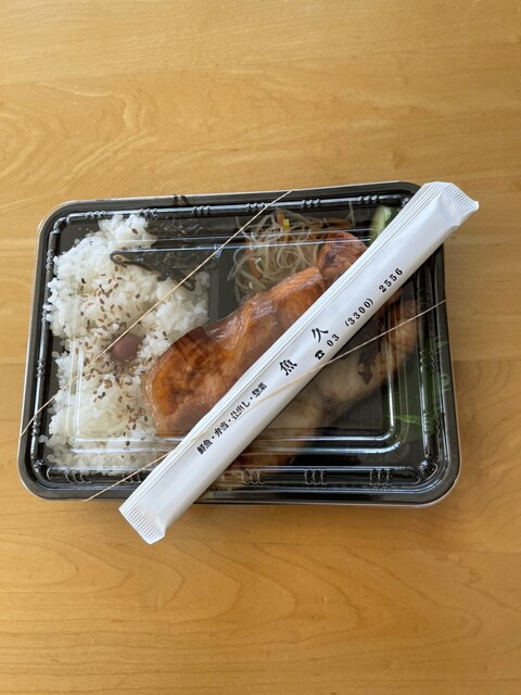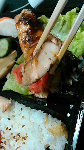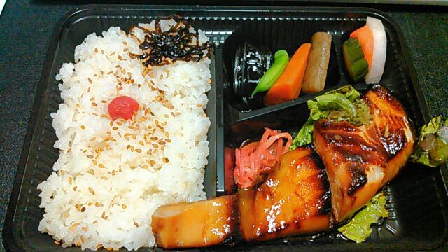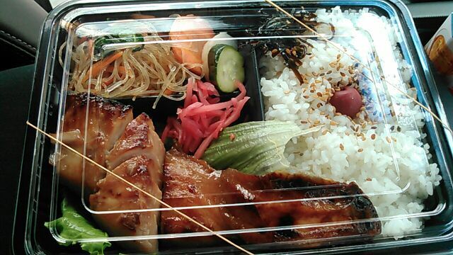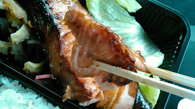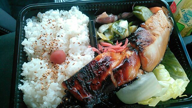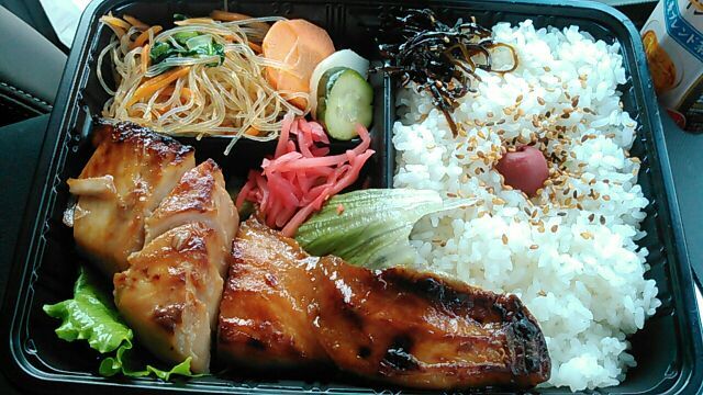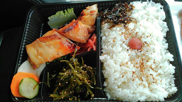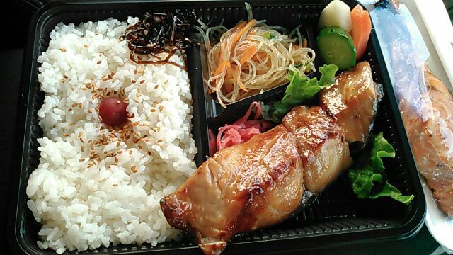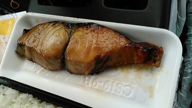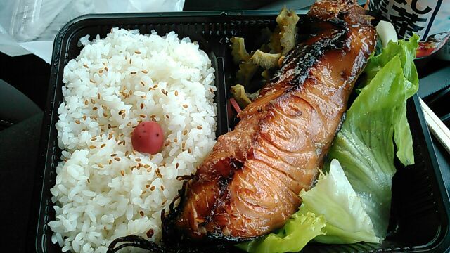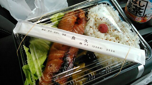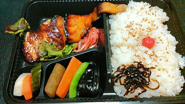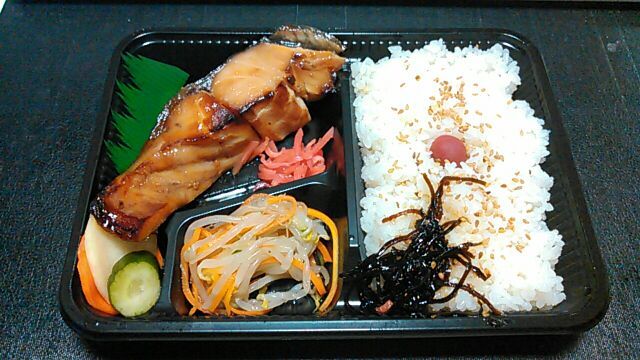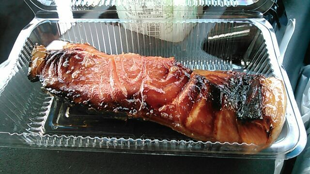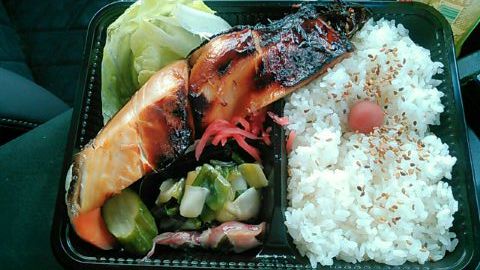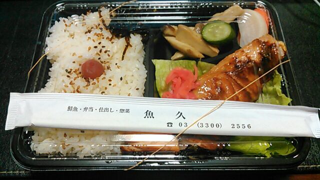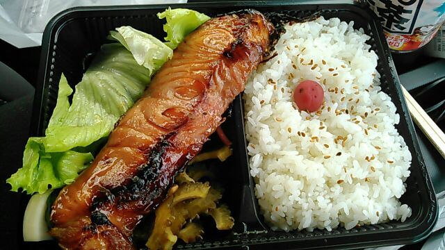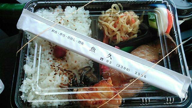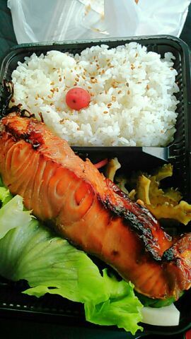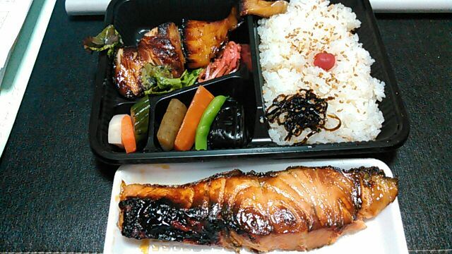 ★2017・9再訪 今日はランチにツキが無くて狙って行く店が尽く休みだったり、工事中だったりフラレにフラれてたどり着いたのが魚久、2度目の訪問です。時間は12時半過ぎでしたが先客は2人で、それほど待たずに弁当をゲット出来ました。注文はさわらやメカジキ、ブリの照り焼き、時鮭の西京焼き、秋刀魚塩焼き。。。うーん、困った。。。そこで最後に目についたのが「キングサーモンの照り焼き」、若いころ、築地の鮭屋で働いていたのでキングサーモンがキングオブサーモン!だったのはよーく知ってました(笑)店では「マスの助け」、通称「スケ」って呼んでましたが、上物扱いの店にしか売れない代物でした。脂の乗り等、他の鮭と比べて群を抜いて旨い鮭です。そんな弁当は680円、おかずに「手作りハンバーグ・330円」を添えて車中食です。想定通りキングは脂の乗りも身離れも良くて凄く美味しかったですね、副菜のゴーヤの漬物、自家製ぬか漬け、切りコンブの佃煮は至って普通、330円もするハンバーグも普通でした(笑)