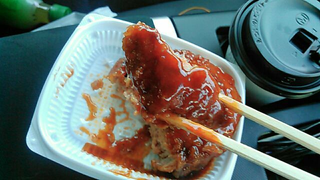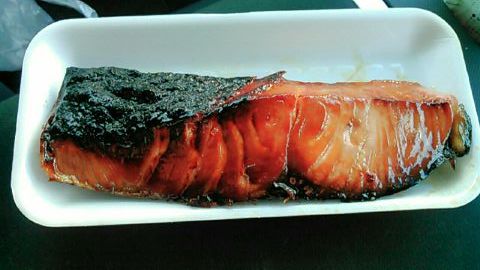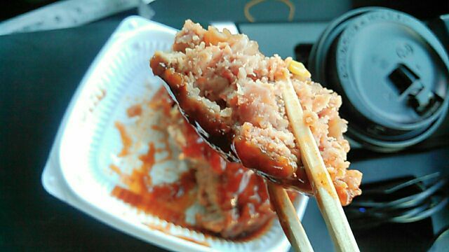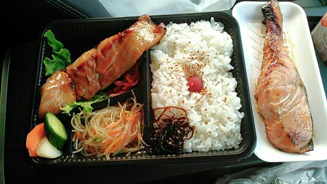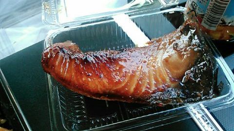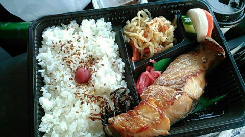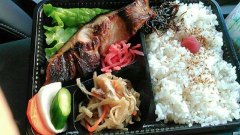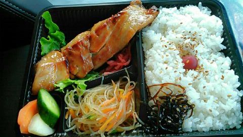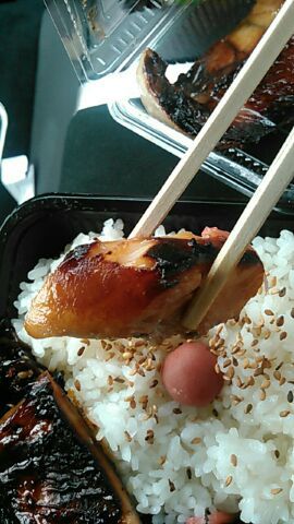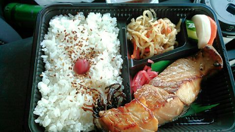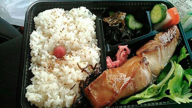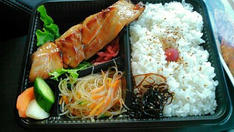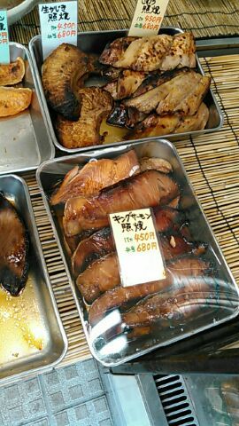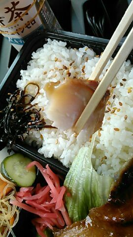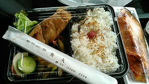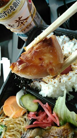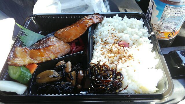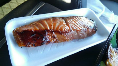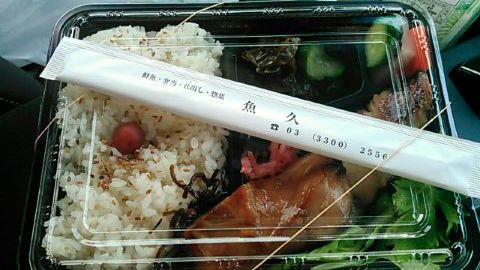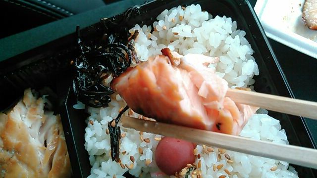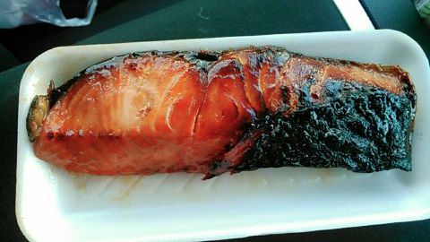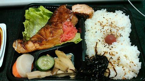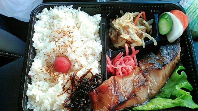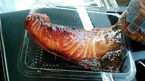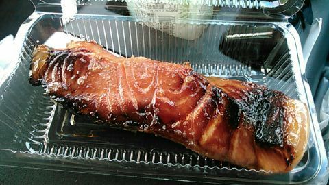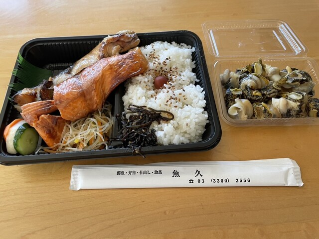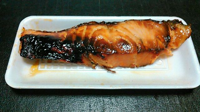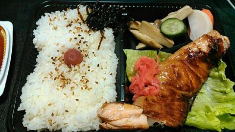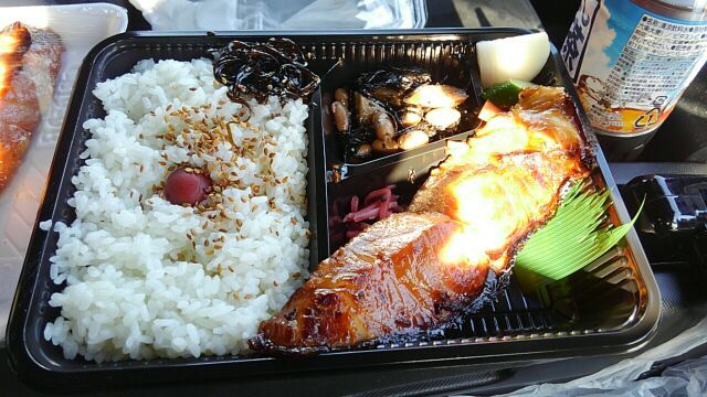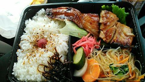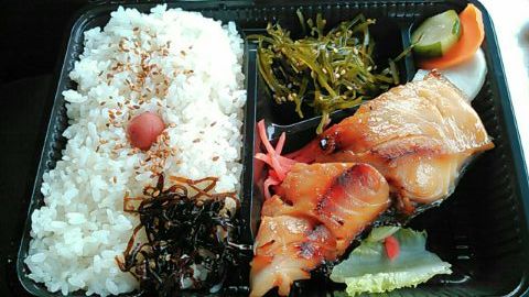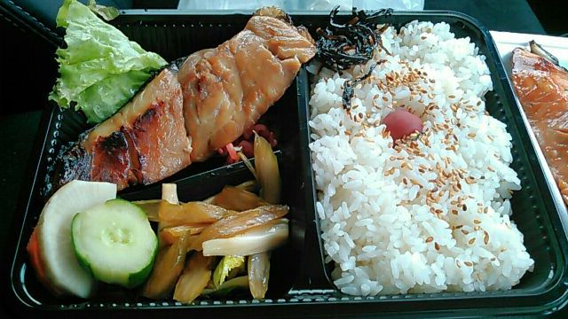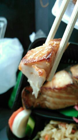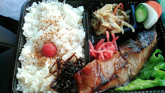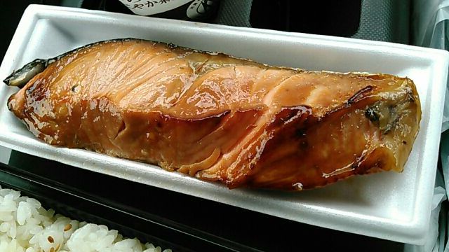 ★2017・9再訪 今日はランチにツキが無くて狙って行く店が尽く休みだったり、工事中だったりフラレにフラれてたどり着いたのが魚久、2度目の訪問です。時間は12時半過ぎでしたが先客は2人で、それほど待たずに弁当をゲット出来ました。注文はさわらやメカジキ、ブリの照り焼き、時鮭の西京焼き、秋刀魚塩焼き。。。うーん、困った。。。そこで最後に目についたのが「キングサーモンの照り焼き」、若いころ、築地の鮭屋で働いていたのでキングサーモンがキングオブサーモン!だったのはよーく知ってました(笑)店では「マスの助け」、通称「スケ」って呼んでましたが、上物扱いの店にしか売れない代物でした。脂の乗り等、他の鮭と比べて群を抜いて旨い鮭です。そんな弁当は680円、おかずに「手作りハンバーグ・330円」を添えて車中食です。想定通りキングは脂の乗りも身離れも良くて凄く美味しかったですね、副菜のゴーヤの漬物、自家製ぬか漬け、切りコンブの佃煮は至って普通、330円もするハンバーグも普通でした(笑)