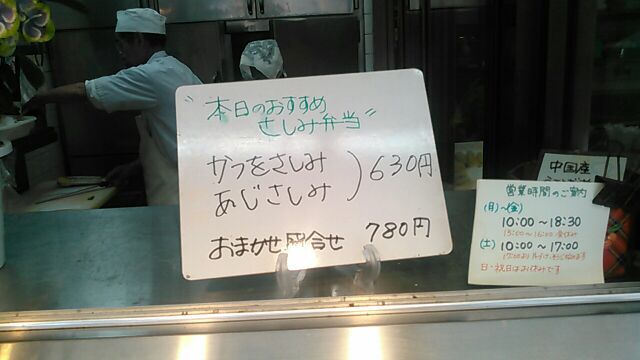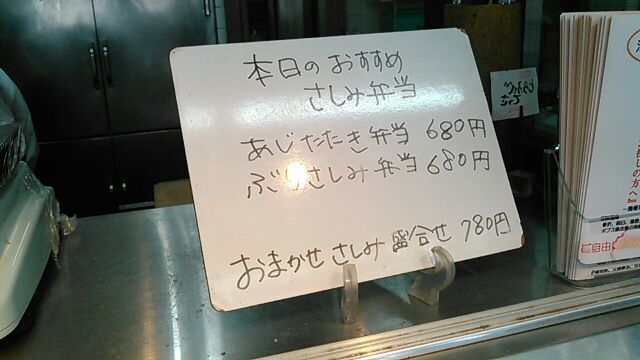 ★2019・3再訪 まだ11時ちょい過ぎなのに店内はなにやら混んでいて、若いお巡りさんが2人中に居ます。あーびっくりした、何かあったのかと思ったらお客でした(笑)外で待っていると後客が4人(内、新しいお巡りさんが2人・笑)また警官が「お巡りさんチャリ」でやって来た!どうも昔から警官を見ると逃げ出したくなるか目を合わせないようにするのは私だけでしょうか?(笑)さて注文ですが見事に皆さん、一番人気の「おきめだい」は外さずそれをアタマに連複と購入してます。今日の自分は、「おきめだいからキングサーモン」1180円の高級馬券です(笑)若女将曰く「お巡りさんはお客さんで多いんですよ」だって、おそらくあの甲州街道の給田交番から買いに来るのね。「強盗が来なくていいじゃない」に、いつも暗~い雰囲気の店内が大笑い、若いお廻りちゃんも笑ってました(笑)イイ店です。。。w