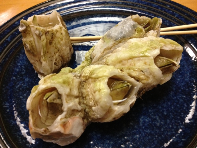 フジツボ、初めて食べました。磯の香りとトロッとした舌ざわり、いい塩味でした。当地に来て、是非とも食べたかったのが、貝焼き味噌でした。ホタテと玉子とじ、味噌味が良いコンビネーションでした。お酒も、同僚のおかげで、滅多に飲めない山廃田酒を頂きました。これは、めっちゃ旨い酒だと思います(^O^)/