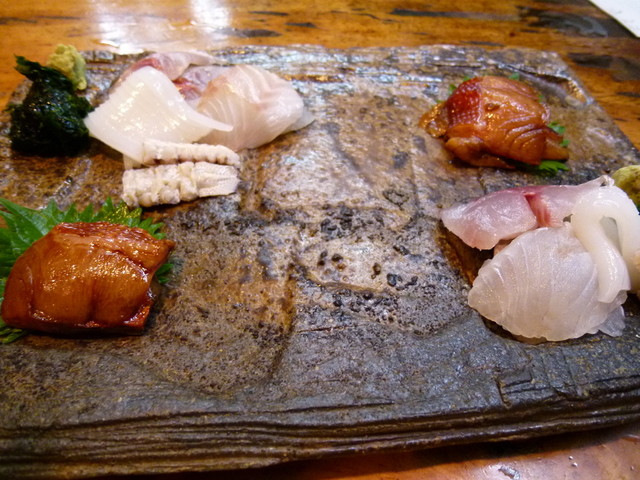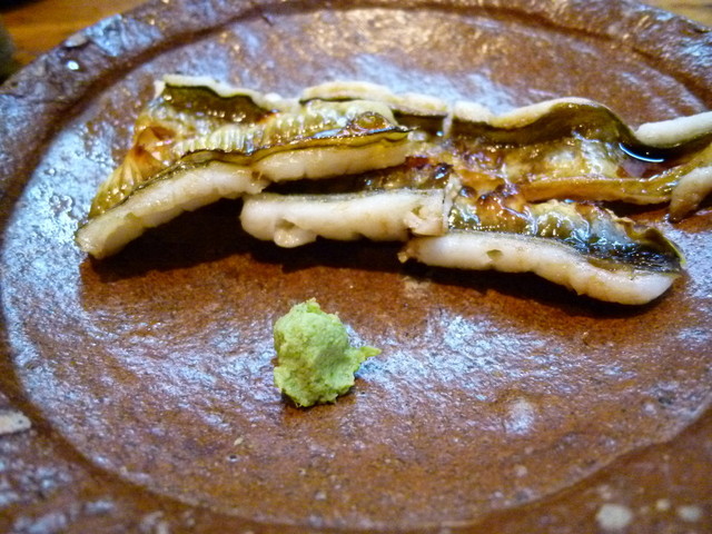 頼んだのは、①刺身盛り合わせ(この日はヨコとシマアジ。分厚い切り身です。)2人前②鰹のたたき2人前(本当に絶品!)③ボウゼの塩焼き4人前④蛸と分葱の酢味噌4人前⑤〆に名物、うなぎのお寿司2人前(ほぼお客の100%が注文!)。鰻は生簀から取り出し、その場で捌き、炭火で焼く。焼き立てです!