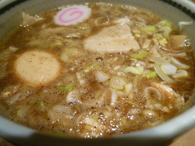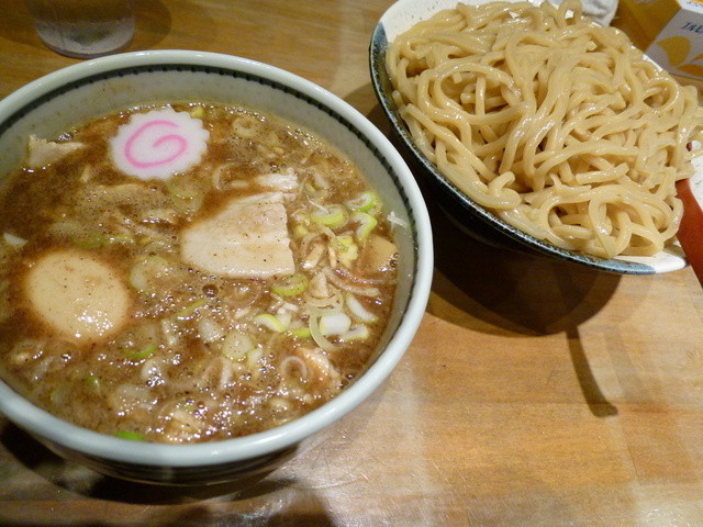 今日のランチは、息子と一緒に狢に行きました。食券で、豚つけ麺(中)900円に味玉100円、長ねぎ100円の合計1,100円。息子はつけ麺(中)800円に味玉100円で合計900円。二人で2,000円。12:50に行くと丁度入れ替わりで、待つことなくカウンターに着席。待つこと約10分。つけ麺が来ました。やっぱり、うまい!もっちり麺に濃厚なスープ。具も角切りチャーシューに豚バラ肉、太メンマ、長ねぎ、玉ねぎ、ナルト、味玉。割りスープを飲んで店を出るころには、行列が少しありました。また、来ます!