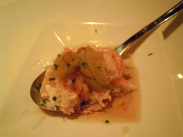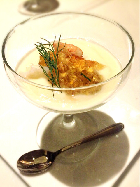 アミューズ カリフラワーのムースかな?かに身が乗せられています。シャンバンに合うー!