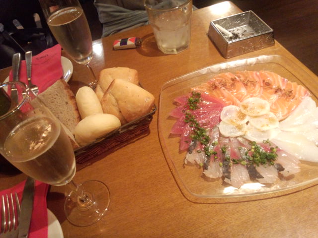 まずはやっぱりスパークリングをボトルで~あとは間違いなくカルパッチョを!!