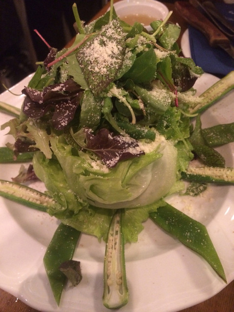 砂肝、豚肉のパテ、小魚フリット、スモークチーズ、チキンがサラダの上に乗ってます!さらに粉チーズをぶっかけてくれます!