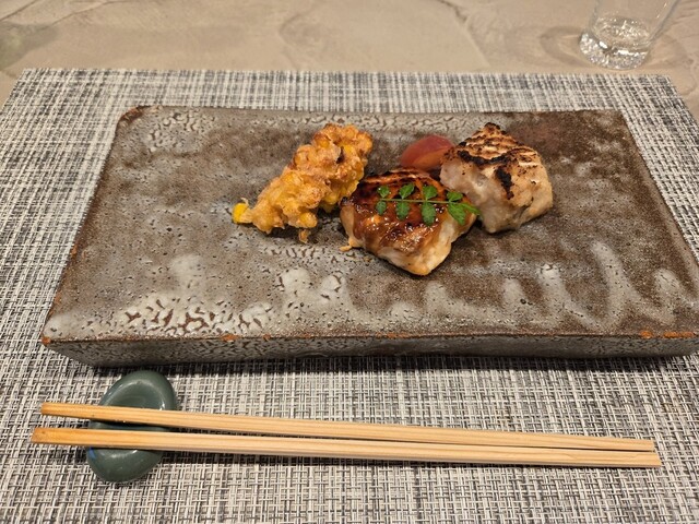 <焼き物> 甘鯛の鱗パリパリ焼きの白子鋳込み 小芋のかけらもち揚げ、白エビのかき揚げ、粉唐墨掛け