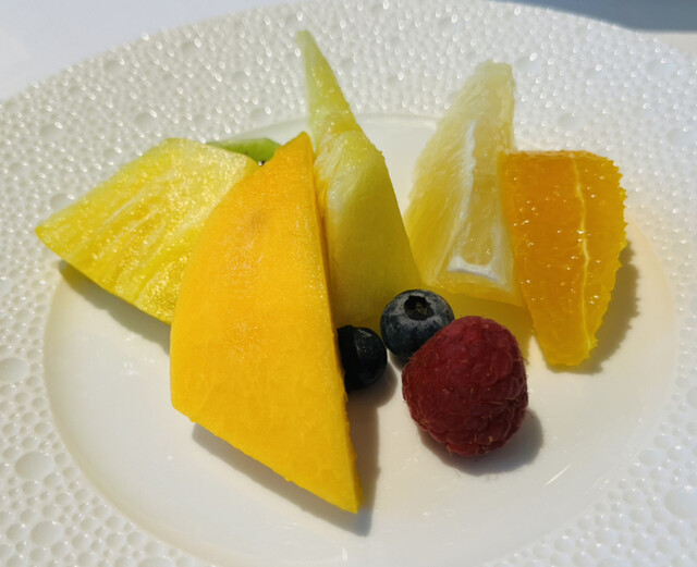 ボージャルダン、美しい庭と名付けられた朝食のコース。季節のフルーツジュースは初物の白桃。甘さ控えめが良い。サラダには人参のドレッシングが合っている。メインをフレンチトーストか、エッグベネディクトからセレクト出来る。フレンチトーストにはフルーツの盛合せ。朝食としてポーションはちょうど良い。