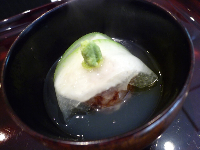 饅頭の上には酒蒸し鰈、さらに覆うように冬瓜がのせられています。