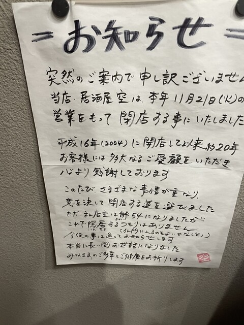 大将の人柄もよく、東京出張の時は欠かさず伺いました。こんな店がなくなるなんて本当に悲しい。宮城の地酒の本当の美味しさを伝えてくれた店でした。