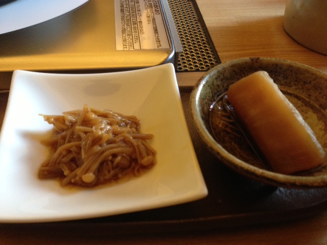 まずは前菜(というか付き出し?)にダイコンの煮つけと、自家製なめたけが登場。ダイコンがもう熱々で煮汁が