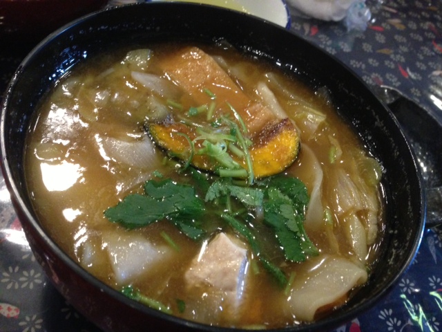 定食に付いている根菜の煮物はタケノコ、レンコン、ゴボウ、ダイコン、シイタケです。ま、苦手な食材も
