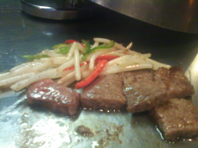 さてさてお料理の方ですが、夕食でしたのでちょっと奮発して「ステーキと海鮮のコース」(8000円)を注文。