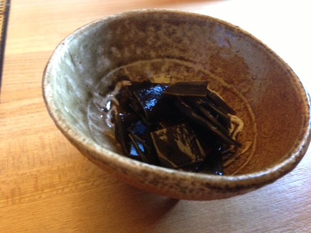 まずは前菜(というか付き出し?)にダイコンの煮つけと、自家製なめたけが登場。ダイコンがもう熱々で煮汁が