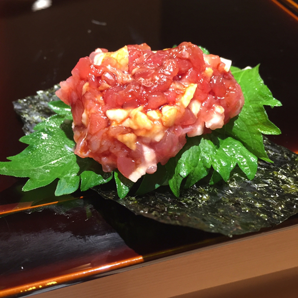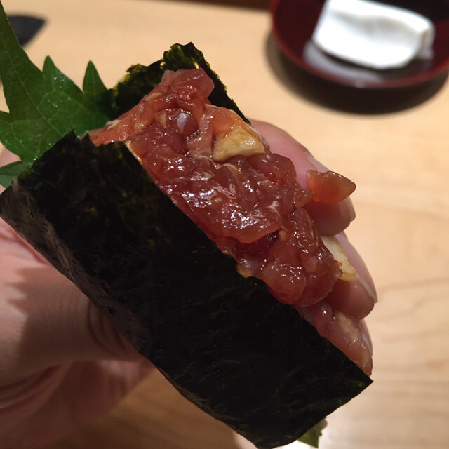 赤身と山芋を叩いたタネを紫蘇、海苔と一緒に巻いて食べる。