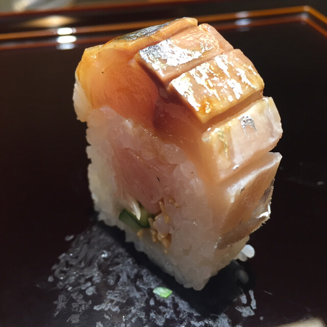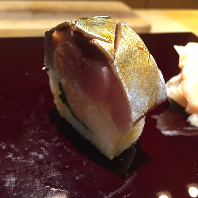 シャリの中にべったら漬け? ガリ? が仕込んである。棒寿司はシャリの量が多いので、シャリが重く感じる事も多いのですが、そのべったら漬け? ガリ? のおかげで食感が変化するので、最後まで飽きさせない。鯵の香りも良く、シャリに入ったゴマの風味も相まって重層的な味を感じさせます。