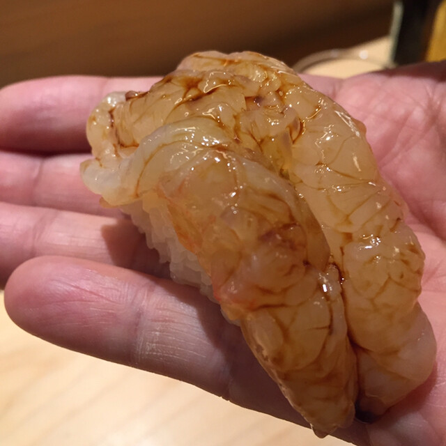 普段は手渡しの握りはあまりされないそうなのですが、この日はぼたん海老の握りは手渡しで供されました。
