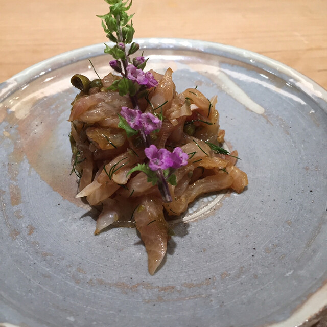 鮨ではなく箸休めの一品かと思いきや、下にちゃんとシャリが入っててお鮨だった。