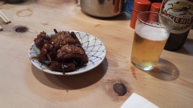 ビール大550円と、串を頂きます。ビールは瓶ビールで、生はありません。