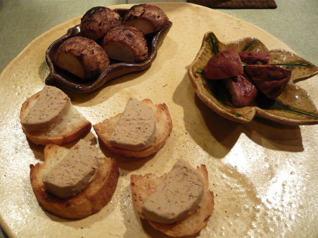 お通しは、栗の煮たもの、サトイモの燻製、京鴨のリエット。