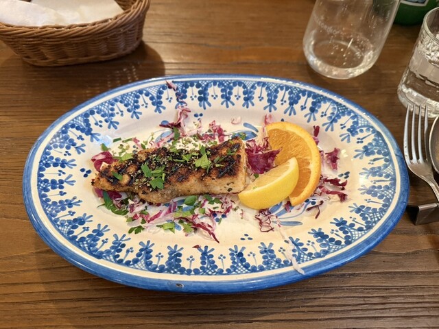 メカジキは新鮮な厚切りのメカジキをローストして、濃い焼き目がアクセントになる調理法。レモンを絞っていただくのだが、どこか日本の塩焼きに似ていて馴染める美味しさ。