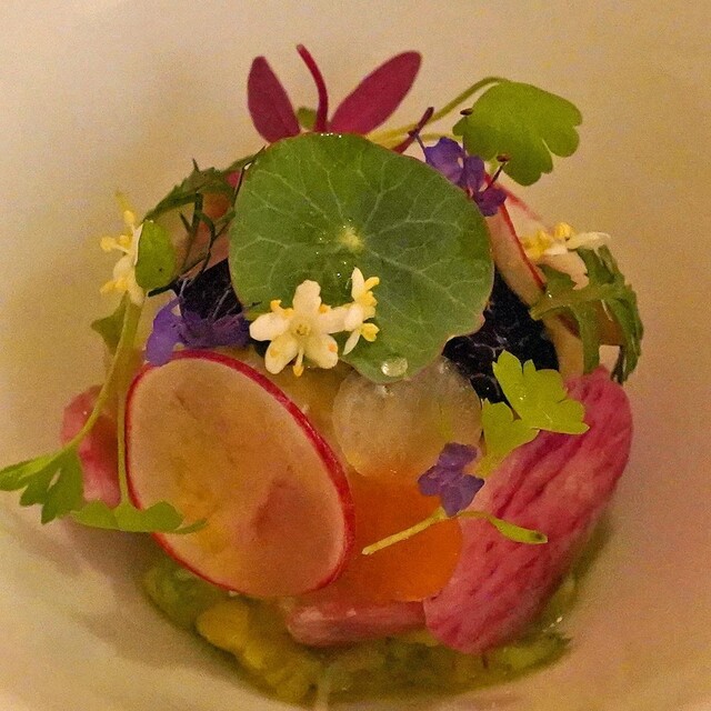 ビーツを加えたクランブルを赤土に見立て、その上に季節の野菜をその野菜に適した調理したものをのせております、炒った向日葵の種、ローストしたアーモンド、仕上げにピーナッツオイルを回しかけ、香ばしさも加えた見るのも楽しい一皿ですね。