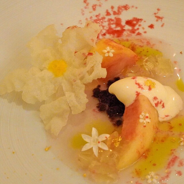 福島県産の ”とろもも” は非常に香り高く、甘いのが特徴です、少し食感が残っている時が香りのピークで、その状態のものを使用しており、ももの香りを凝縮させた餡のソースや、大葉のオイル、ももの葉とレモングラスを効かせたゼリーを合わせており、フイヤンティーヌ・ショコラを食感のアクセントにし、ミルクのアイルクリームと凍らせたすももの爽やかさを楽しむ一品でした。