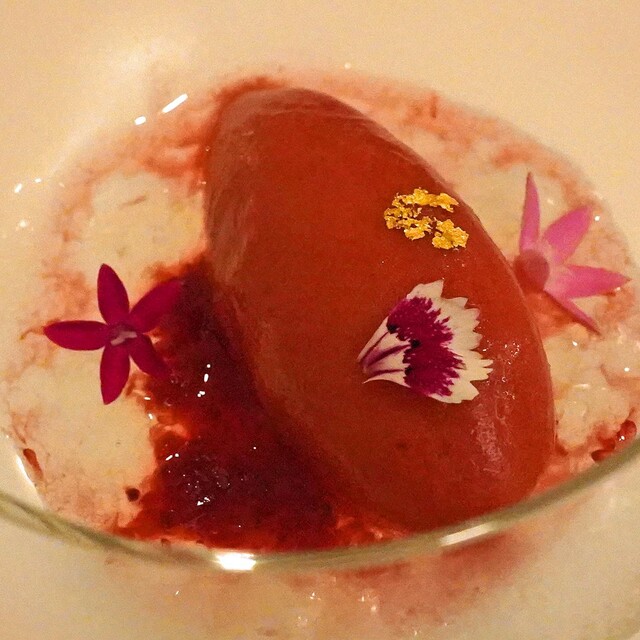 黒いダイヤとも呼ばれる、市場に出回らないフルーツを使った一品で、酸味を活かして爽やかなソルベにして、バラの花の香りをつけたゼリーを添えてあります。