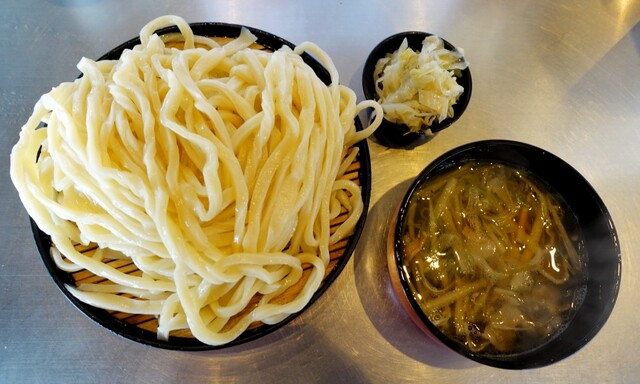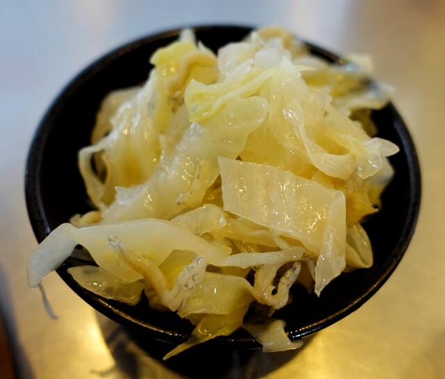 ”塩肉ネギつけめんうどん“にじゃこキャベツをトッピングして頂く