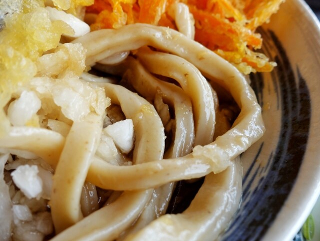 今日は、ガシガシで冷たいうどんが食べたくて、久しぶりにこの店にお邪魔しました。暑い時には“冷やしたぬきうどん”を頼みたくなります。小盛りをお願いしましたが、麺は400gありますので充分満足できます。ここのたぬきは実質天ぷらうどんで、さつまいも、茄子、人参、玉ねぎ、ピーマン、竹輪がカラッと揚がっており、出汁と絡むととっても美味いです。やや粗めにカットされた鬼おろしは、天ぷらとともに食べるといいアクセントになります。カイワレもいい感じです。相変わらず硬めのガシガシ麺は、圧倒的な吸引力が無ければ、すする事が出来ません。噛めば噛むほど、小麦の香りが口いっぱいに広がります。人参の天ぷらはバラバラなので、麺と出汁のつなぎになりいい仕事をします。最終盤に備え付けのゴマ油を投入すると、良い味変になります。ご馳走様でした。