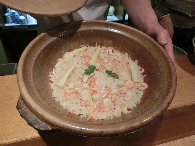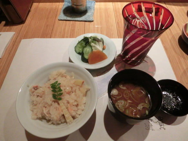 タケノコとサクラエビの炊き込み御飯、香の物とお味噌汁