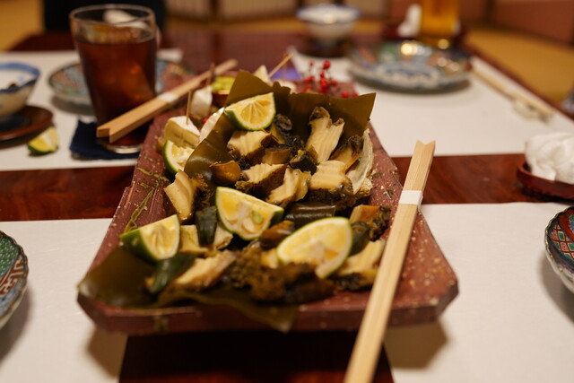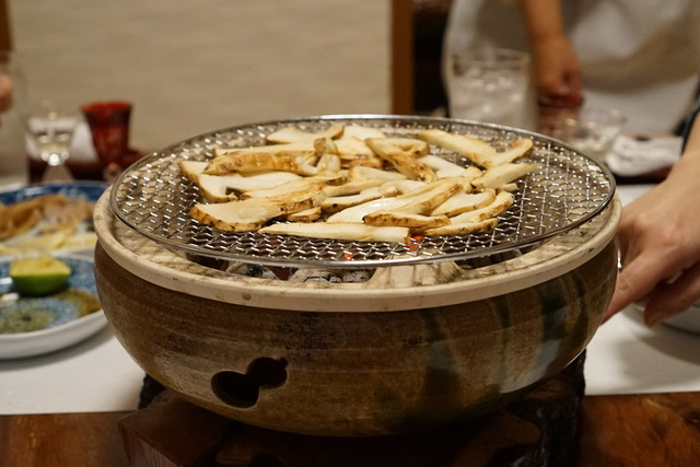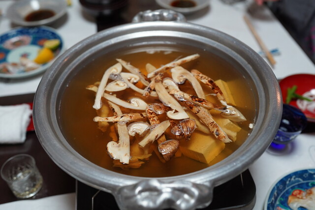 そこにアツアツの焼き松茸を挟んで食べるんですが、
