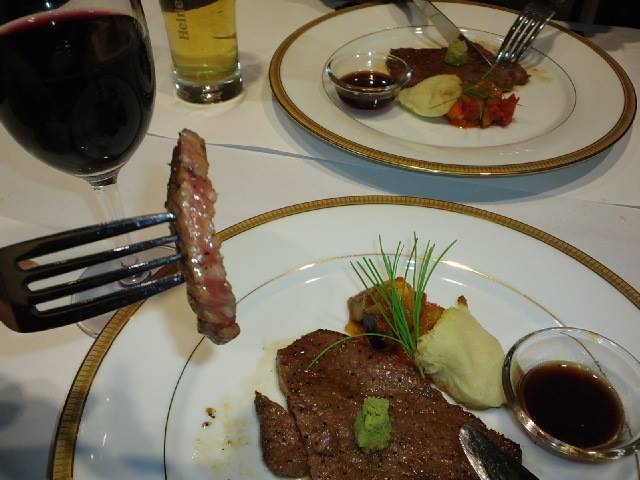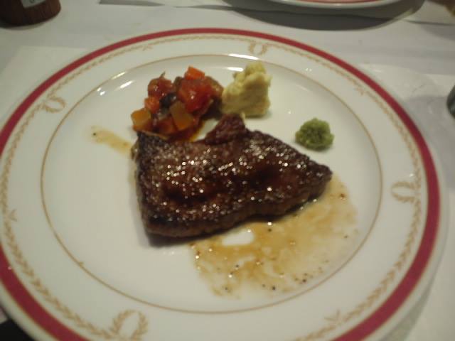 お待ちかねのメイン! ローストビーフ好きでステーキはレアが好きな私にとって焼き加減を聞かれないで出てくるステーキは