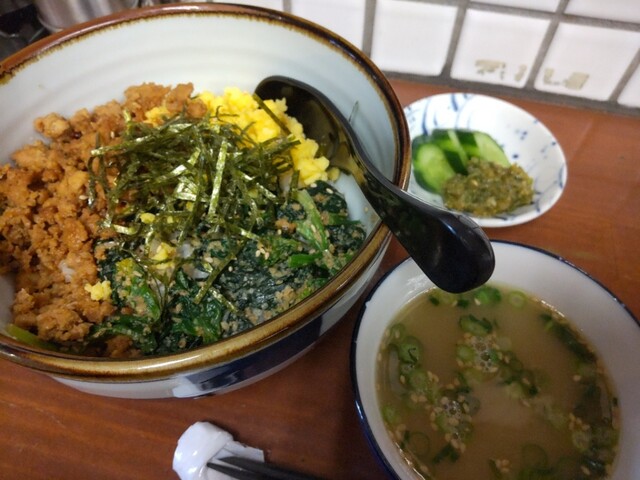 三色は鶏そぼろと玉子とほうれん草ごま和え