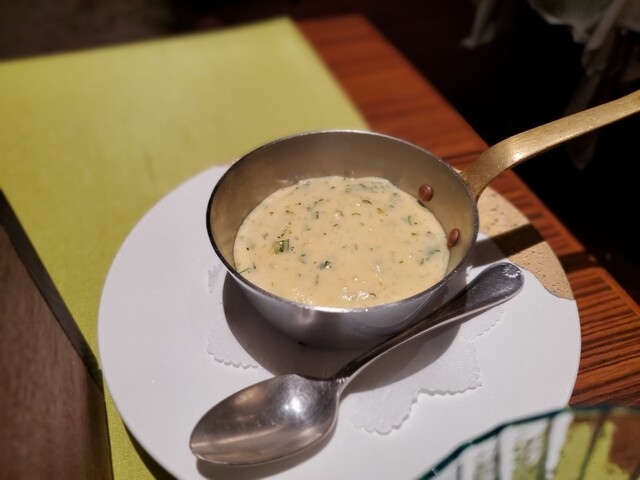 アミューズはいつもの竹炭のマカロン、グリーンピースのムースとオニオンヌーボーのヴルーテ、釜揚げしらすのキッシュ。キッシュが相変わらず美味い。グリーンピースのムースも美味い。この手のヴルーテやムースで素材の味がこれほどしっかりしてるのも珍しい。