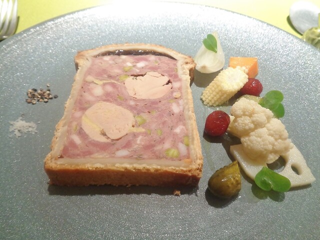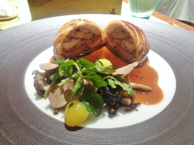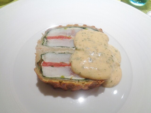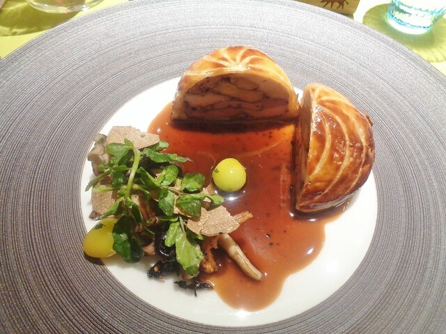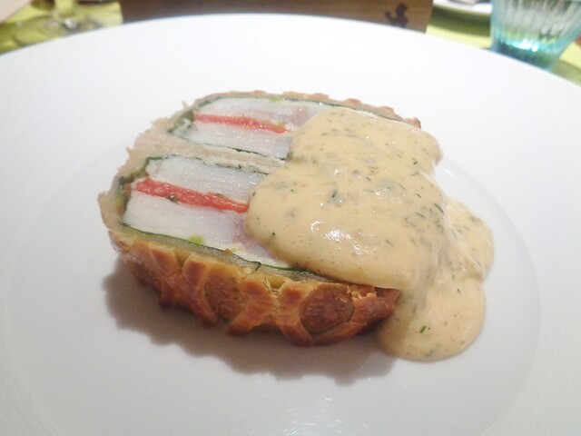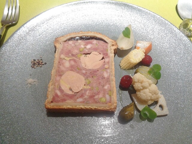 パイ包み料理一つめのパテ・アン・クルート。以前はオーバル型での物でしたが、今回はオーソドックスな長方形の型。ファルスは2種類の肉とフォアグラ、ピスタチオ。私が他所で食べた事ある物のファルスは肉は最低でも3種類以上使ってる事が多かった。詳しい内容は記さないですが、2種(内一つは白肉)でこれ程の味の重厚感をだせるのは凄い。しっかり焼き込まれたパートの食感のとても良かった。