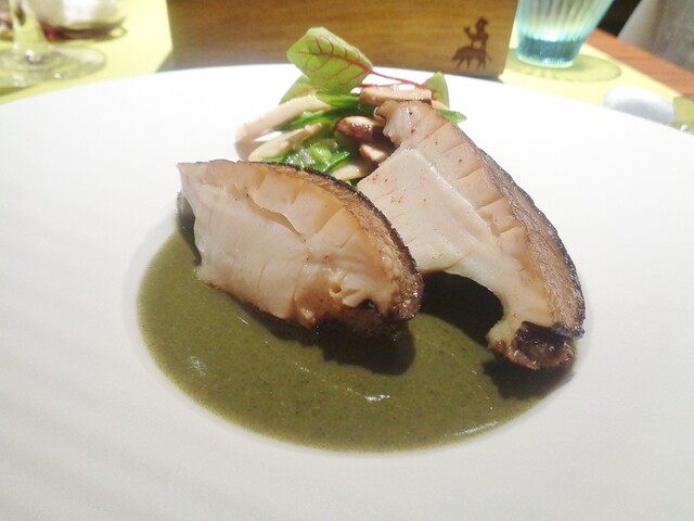 前菜の八色椎茸なんかはメニューだけみると椎茸が主素材?とか思ってしまいそうですが、めっちゃ凄い。ロブションのスペシャリテの一つトリュフのタルトをモチーフにした物で焼いて押しつぶした薄いフィユタージュに玉ねぎとベーコンのコンポート、トリュフアッシェを乗せ椎茸をあしらい焼いた物。最近タイムリーに椎茸に目覚めたせいかえらい感動した一皿でした。