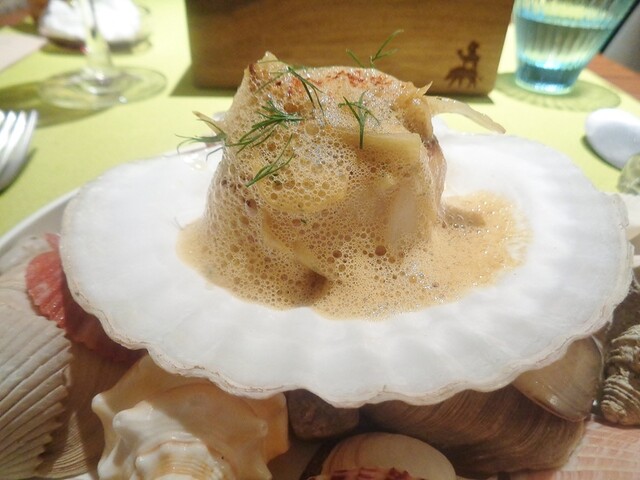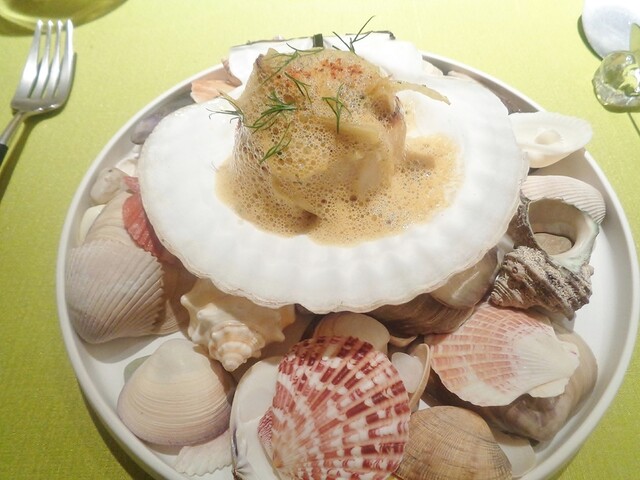 ホタテはデカイ活けの物。他所ならポワソンで出す代物だろう。ういきょうのソテーに軽く立てたスープ・ド・ポワソンのソースで。