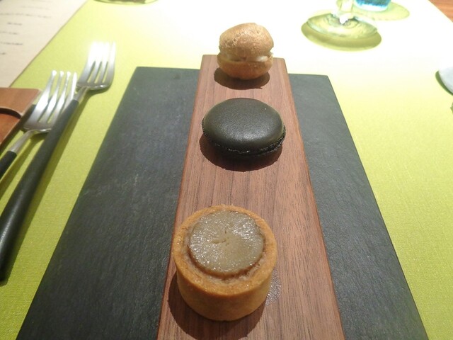 アミューズ1は3点盛り。竹炭のマカロン、グリーンピースのムースと新玉ねぎのヴルーテ、釜揚げシラスのキッシュ。キッシュのパートがサクサクで美味しい!