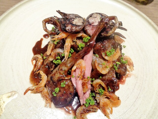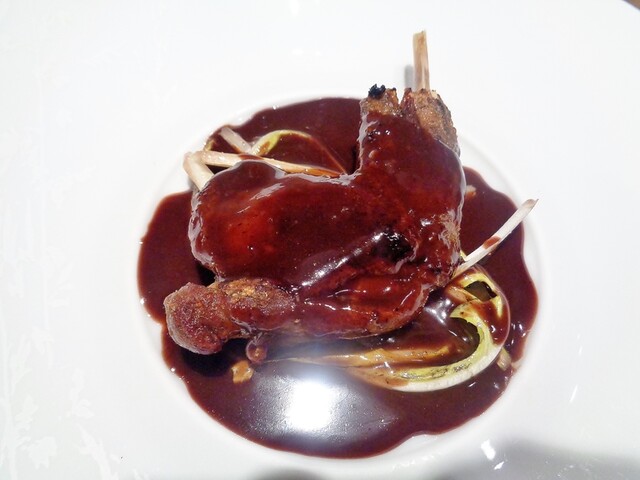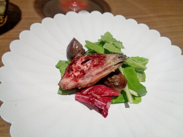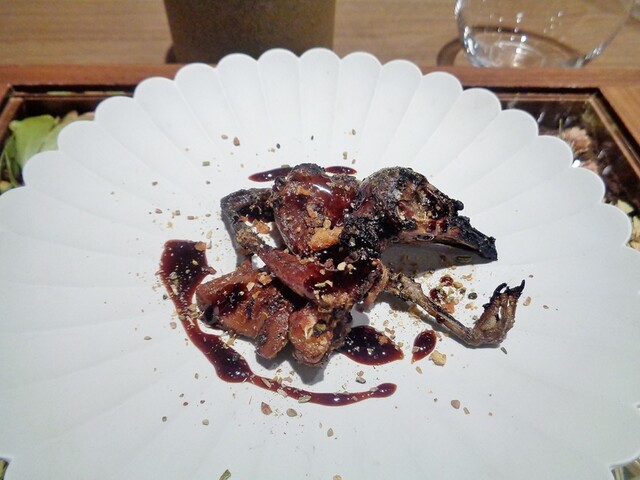 前菜にヒヨドリの炭火焼き。ラケっぽくソース纏わせて焼いてあるのでめっちゃ美味かったです。