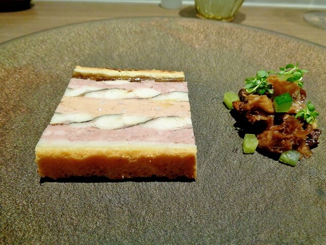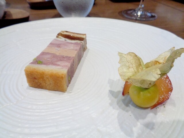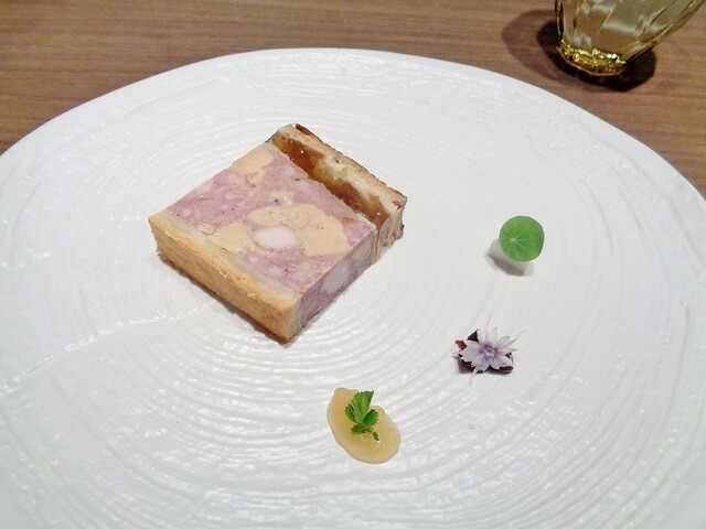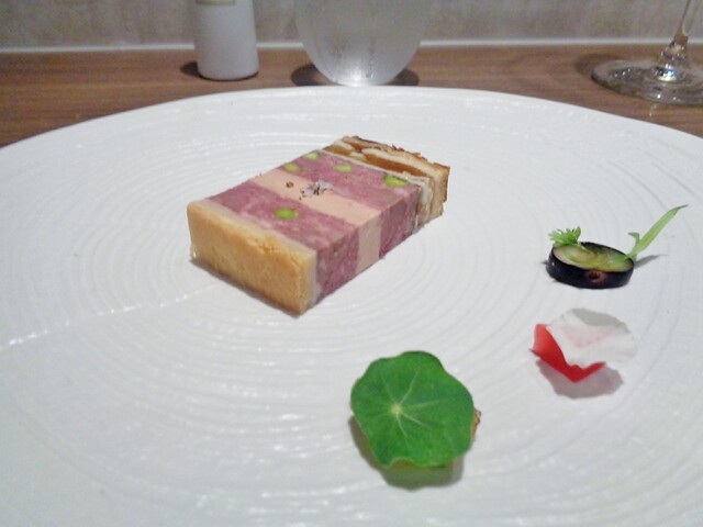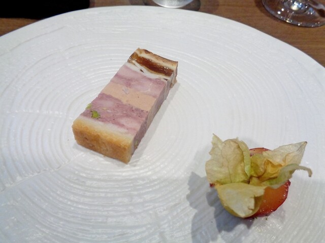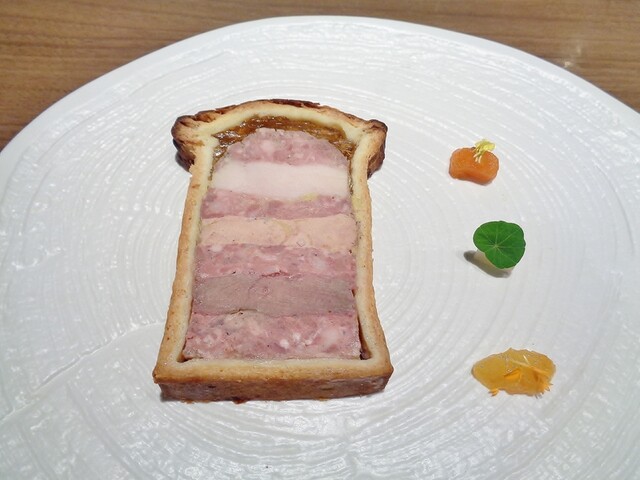 前菜3はコルヴェールのパテ・アン・クルート。あまり熟成はさせてないと言いますが、味わいは濃くしっかり。だいたい様々な種類の端肉を合わせてファルスにするのが多いですがコルヴェールのみとは非常に贅沢です。味を重ねなくてもここまで味を出せるのはシェフならではでしょう。
