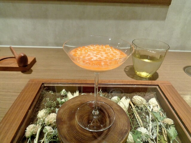 みかんのブランマンジェにはグランマニエでマリネしたイクラと山わさびのエキューム。
