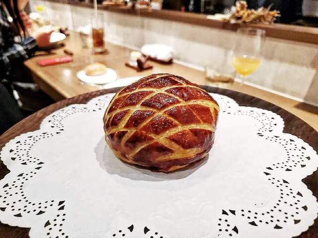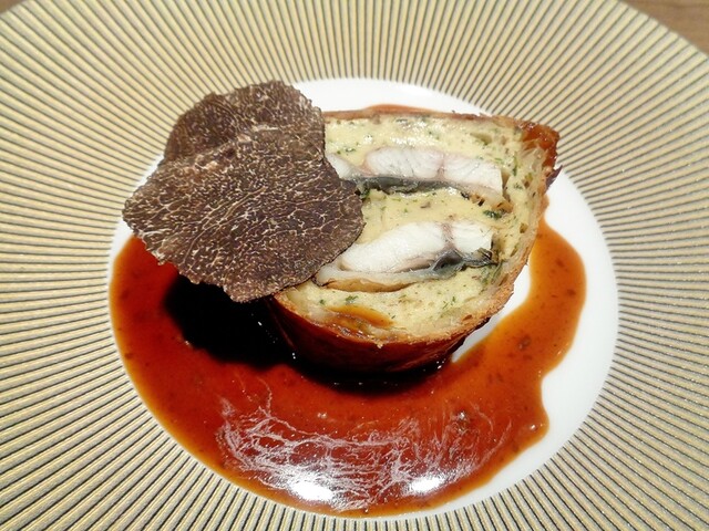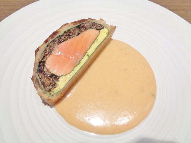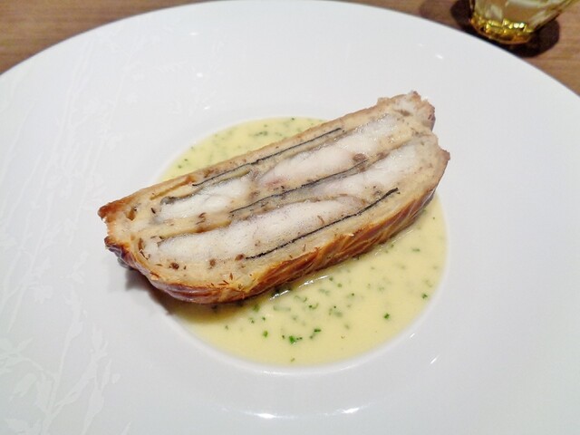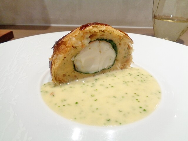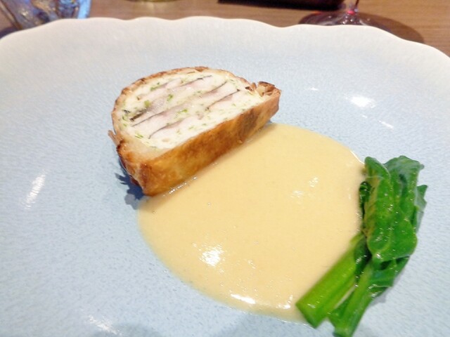 魚料理はキンキのパイ包み焼き。魚介系のパイ包み焼きは結構久しぶりでした。高級魚キンキと国産のサフランを使ったムースがファルスになった物。ソースは店で使ってる魚のアラやオマールのガラ、イカなどを余す事なく使ったブイヤベース風ソース。こんなのはどう考えても不味いわけがない。
