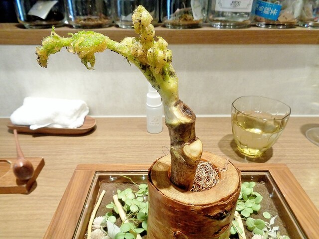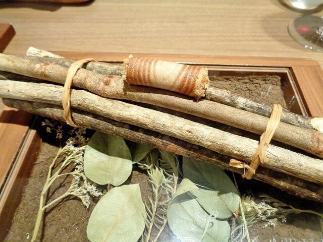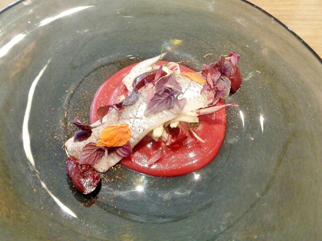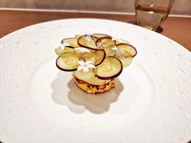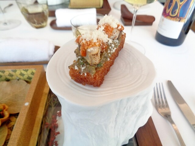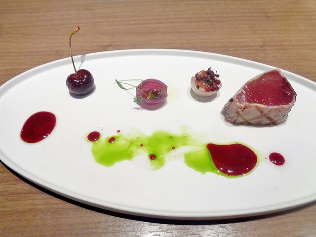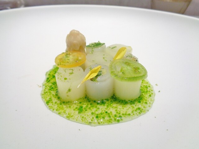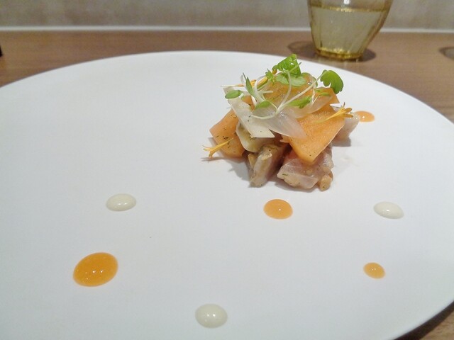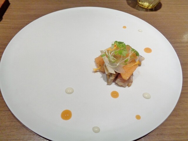 前菜1は海亀のタルタル。今回はスタイルを変えて。大根で筒状にしてカネロニっぽく。トマトなどのピクルスと合わせてあります。トマトの酸と甘味が海亀の昆布のような香りとが結構よく合います。どちらかと言えば加熱した物の方が好きでしたが、今回は生じゃないと感じないような味や香りを感じれてとても良かった。
